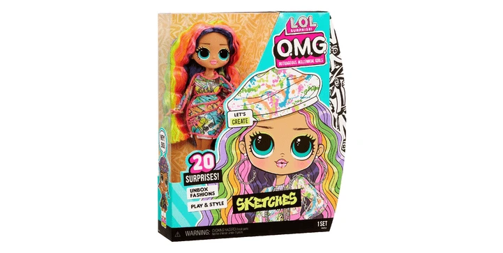 Die brandneue LOL Surprise OMG Modepuppe Sketches mit 20 Überraschungen ist da! Sketches hat umwerfende Gesichtszüge, schöne Haare und einen ganz eigenen künstlerischen Stil. Außerdem ist sie die große Schwester der beliebten LOL Surprise-Figur Splatters.