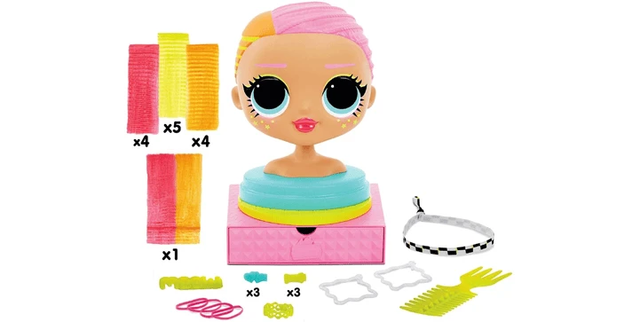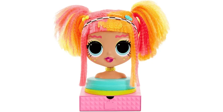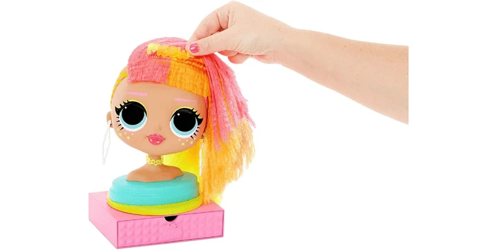 Die welligen Haarteile von Neonlicious können individuell angebracht werden. So entstehen immer wieder neue Kurz- oder Langhaar-Frisuren. Inklusive vielen Überraschungen, Accessoires und Zubehör zum Frisieren. Zudem ist ein kleines Schubfach enthalten, in dem das Zubehör ordentlich verstaut werden kann.