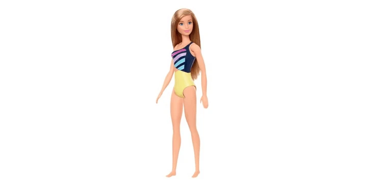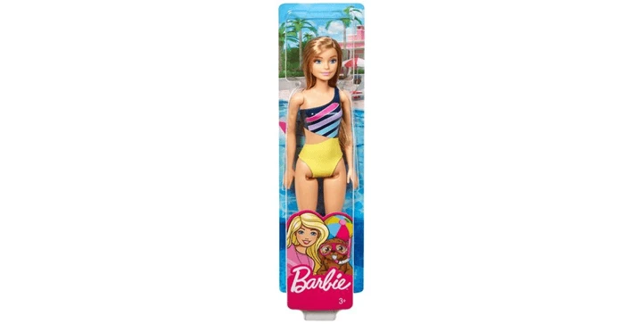 Mit ihrem schick gemusterten, trendy Badeanzug, der genau ihrem Geschmack entspricht, ist diese Puppe bereit für sommerlichen Badespaß.