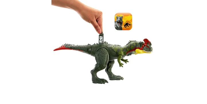- Verbinden und spielen! Dazu wird der verborgene Track-Code des Dinosauriers in der kostenlosen Jurassic World Facts-App auf einem kompatiblen Smartgerät gescannt (nicht im Lieferumfang enthalten), um ein AUGMENTED REALITY-Erlebnis und Spiele zu aktivieren.