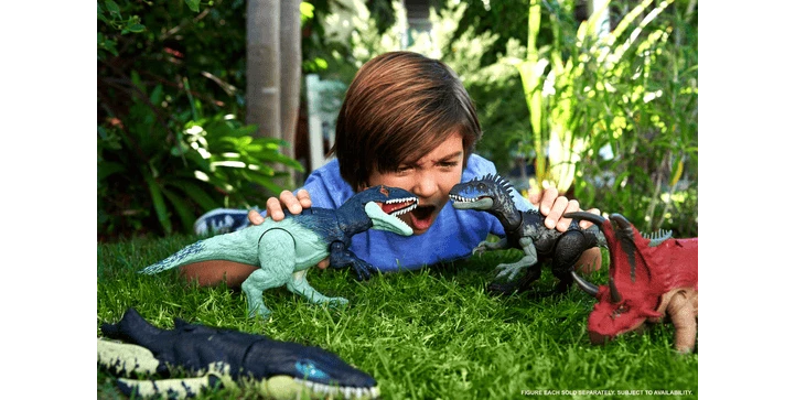 - Die Jurassic World: Ein neues Zeitalter Wild Roar-Figuren verfügen über BRÜLLGERÄUSCHE und eine ANGRIFFSBEWEGUNG.