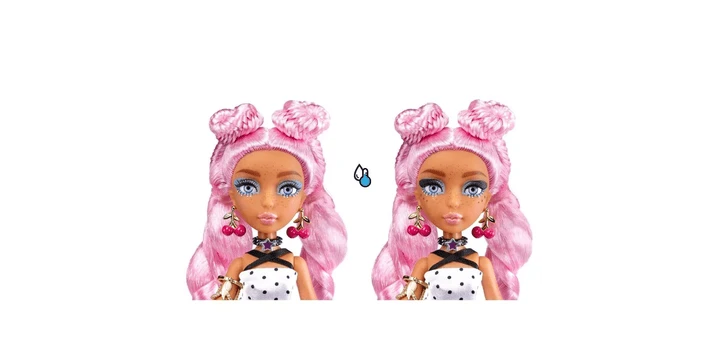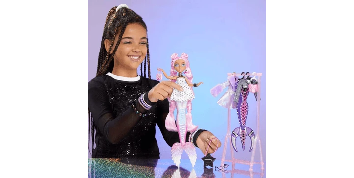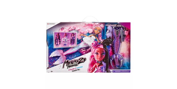 Jenseits der Wellen, unter der Brandung, im tiefen Blau… folge den fabelhaften Flossen der Mermaze Mermaidz und entdecke etwas Erstaunliches! Morra ist geheimnisvoll und unerwartet – sie steuert ihre einzigartigen Verwandlungskräfte in Form von verschiedenen Looks. Morra zieht sich gerne süß, salzig oder eine Mischung aus beidem an! Morra hat zwei einzigartige, austauschbare, modellierte Schwänze und Flossen, verschiedene Kleidungsstücke, Accessoires und einen Kleiderständer, um alles zu präsentieren. Ihr Haar ist zu rosa Zöpfen geflochten, aber wenn du es aufmachst, findest du darunter schwarze Strähnen, mit denen du endlos viele lustige Frisuren kreieren kannst. Auch ihre „süße“ Flosse und ihr Augen-Make-up verändern ihre Farbe dramatisch, wenn sie in eiskaltes Wasser getaucht wird. Beobachte, wie sich ihre Flosse von Ombre-Pink und Silber in atemberaubendes Schwarz verwandelt und wie sich ihr Lidschatten von Blau zu Schwarz mit Sternen unter ihren Augen verändert. Ihre Schwänze dienen als Ständer, wenn die Flosse gebogen ist und sie sich leicht nach vorne lehnt, so dass sie wirklich auf eigenen Füßen stehen kann! Morra ist an Hals, Schultern, Ellbogen, Handgelenken, Rumpf, Taille und Flosse beweglich. Es gibt so viele Posen zu kreieren! Morra wird mit 2 Schwänzen, 2 Flossen, 1 Kleid, 1 Oberteil, 1 Trenchcoat, 1 Jacke, 2 Geldbörsen, 1 Brille, 1 Paar Ohrringe, 1 Armband, 1 Armmanschette und 1 Kleiderständer geliefert, um so viele tolle Looks zu kreieren. Morra hat wunderschöne Glasaugen und echte Wimpern, sowie ein glamouröses Make-up mit blauem Lidschatten. Perfekt zum Spielen im und außerhalb des Wassers! Hinweis: Die Haare der Puppe sehen nach dem Eintauchen ins Wasser möglicherweise nicht mehr so aus wie zuvor.