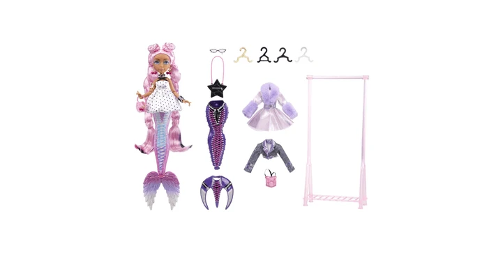 - INKLUSIVE: 1 bewegliche Meerjungfrauenpuppe mit 2 Haarfarben in einer, 2 austauschbare, kombinierbare Schwänze und Flossen, 1 Kleid, 2 Jacken, 1 Oberteil, 2 Handtaschen, 1 Brille, 1 Paar Ohrringe, 1 Armband, 1 Armstulpe, 4 Kleiderbügel und 1 Kleiderständer.