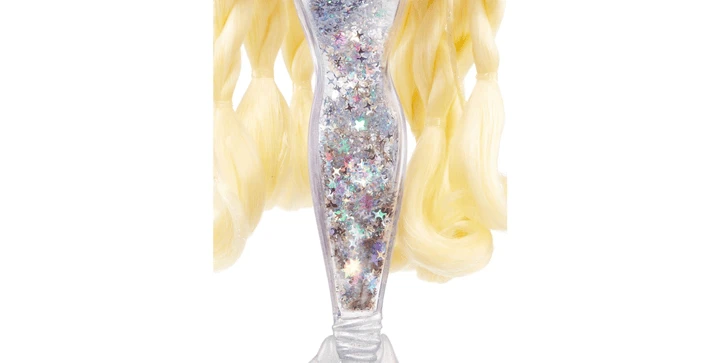 - MERMAID HAIR: Gwen hat wunderschönes, erstklassiges blondes Haar, das in langen, lockeren Locken und Glitzerranken gestylt ist.