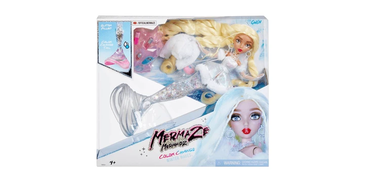 Jenseits der Wellen, unter der Brandung, im tiefen Blau… folge den fabelhaften Flossen der Mermaze Mermaidz, um etwas Erstaunliches zu entdecken! Harmonique und Kishiko haben sich auf ein Abenteuer in das winterliche Land Wintera begeben, wo sie auf dem Weg einige fabelhafte neue Freunde treffen – Nera, Crystabella und Gwen! Jede Mermaze Mermaidz Winter Waves Puppe hat einen bezaubernden, mit Glitter gefüllten Schwanz und ihr eigenes, einzigartig geformtes Glitter im Inneren. Gwen hat einen silbernen 4-Punkt-Stern in Form eines Glitzers! Drehe sie ein paar Mal auf und ab, um zu sehen, wie der Glitter herumwirbelt! Gwen hat eine einzigartige, geformte Flosse, die einen magischen Farbwechsel vollzieht, wenn sie in eiskaltes Wasser getaucht wird. Ihre Flosse wechselt von einem glänzenden, metallischen Silber zu ombre lila und rosa! Gwen trägt ein schillerndes, schulterfreies Oberteil mit weißem Kunstpelzbesatz und Netzärmeln. Zu ihren Accessoires gehören Kronleuchter-Ohrringe, eine mehrlagige Kristallkette, eine Brille und eine wuschelige Handtasche mit Perlenband. Erweitern Sie das Spiel mit neuen Accessoires wie einem Muschel“-Handy, einer Tasse und falschem Make-up! Jede Mermaze Mermaidz Winter Waves Puppe ist an Hals, Schultern, Ellbogen, Handgelenken, Rumpf, Taille und Flosse beweglich, so dass viele Posen möglich sind! Benutze den mitgelieferten Puppenständer, um sie zur Schau zu stellen! Es stellt sich heraus, dass Meerjungfrauen uns sehr ähnlich sind! Gwen ist ein Model mit ozeanweiter Berühmtheit. Sie ist unfassbar glamourös und jedem Trend immer einen Schritt voraus. Sie wirkt manchmal etwas selbstverliebt, aber das ist nur eine Fassade, denn sie ist immer für einen Freund in Not da. Sie trifft Harmonique und Kishiko in Wintera und bringt sie zu Tresses and Tails Salon Spa, wo sie ihnen hilft, ihren fabelhaften Winterglanz zu entdecken! Gwen hat wunderschönes, erstklassiges blondes Haar, das in langen, lockeren Locken und Glitzerranken gestylt ist. Sie hat wunderschöne Glasaugen und echte Wimpern sowie ein glamouröses Make-up mit goldenem Glitzerlidschatten. Bevor du die Farbwechselflosse aktivierst, ziehe das Hemd und die Jacke der Puppe aus, damit sie nicht nass werden. Gießen Sie dann kaltes Wasser über ihre Flosse oder tauchen Sie sie in einen Behälter mit kaltem Wasser. Perfekt zum Spielen im und außerhalb des Wassers! Hinweis: Die Haare der Puppe sehen möglicherweise nicht mehr so aus wie zuvor, wenn sie ins Wasser getaucht wird. Sammle alle Mermaze Mermaidz™ Farbwechsel-Modepuppen: Kishiko™, Shellnelle™, Riviera™, Jordie™, und Harmonique™.