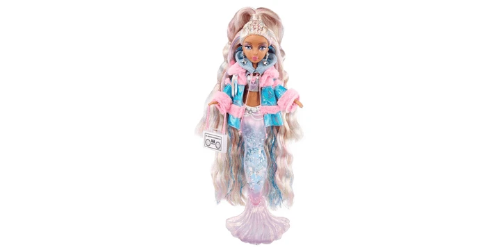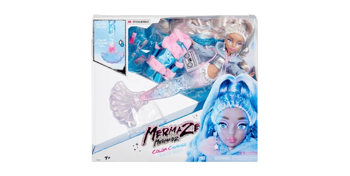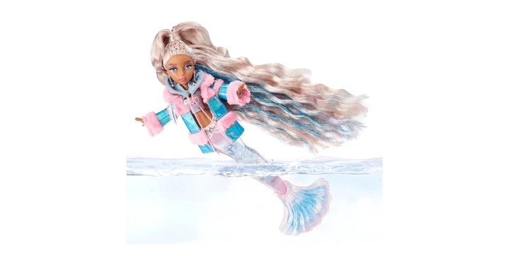 Jenseits der Wellen, unter der Brandung, im tiefen Blau… folge den fabelhaften Flossen der Mermaze Mermaidz, um etwas Erstaunliches zu entdecken! Harmonique und Kishiko haben sich auf ein Abenteuer in das winterliche Land Wintera begeben, wo sie auf dem Weg einige fabelhafte neue Freunde treffen – Nera, Crystabella und Gwen! Jede Mermaze Mermaidz Winter Waves Puppe hat einen bezaubernden, mit Glitter gefüllten Schwanz und ihren eigenen, einzigartig geformten Glitter im Inneren. Kishiko hat einhornförmigen Glitter! Drehe sie ein paar Mal auf und ab, um zu sehen, wie der Glitter herumwirbelt! Kishiko hat eine einzigartige, geformte Flosse, die einen magischen Farbwechsel vollzieht, wenn sie in eiskaltes Wasser getaucht wird. Ihre Flosse wechselt von einem glänzenden Rosa zu einem ombre Rosa und Blau! Kishiko trägt ein Metallic-Tank und einen langärmeligen Kapuzenpulli mit einer schillernden Jacke mit rosa Kunstfell. Zu ihren Accessoires gehören Ohrringe mit Sterntropfen, eine Halskette mit Anhängern und eine Mixtape-inspirierte Crossbody-Tasche. Erweitern Sie das Spiel mit ganz neuen Accessoires wie einem „Muschel“-Handy, einer Tasse und falschem Make-up! Jede Mermaze Mermaidz Winter Waves Puppe ist an Hals, Schultern, Ellbogen, Handgelenken, Rumpf, Taille und Flosse beweglich und ermöglicht so viele verschiedene Posen! Benutze den mitgelieferten Puppenständer, um sie zur Schau zu stellen! Es stellt sich heraus, dass Meerjungfrauen uns sehr ähnlich sind! Kishiko ist eine Trendsetterin, die es liebt zu glitzern. Sie ist ein Internetstar, Schöpferin und angehende Aktivistin, die ihr Leben gerne mit der Welt teilt. Sie ist Expertin für so ziemlich alles, was fabelhaft ist – von Make-up-Tutorials bis hin zu Interviews mit den größten Stars. Kishiko hat langes, wunderschönes, mehrfarbiges Regenbogenhaar, das halb hochgesteckt, halb heruntergelassen und mit langen, lockeren Locken gestylt ist. Sie hat wunderschöne Glasaugen und echte Wimpern sowie ein glamouröses Make-up mit rosa Lidschatten. Bevor du die Farbwechselflosse aktivierst, ziehe das Hemd und die Jacke der Puppe aus, damit sie nicht nass werden. Gießen Sie dann kaltes Wasser über ihre Flosse oder tauchen Sie sie in einen Behälter mit kaltem Wasser. Perfekt zum Spielen im und außerhalb des Wassers! Hinweis: Die Haare der Puppe sehen möglicherweise nicht mehr so aus wie zuvor, wenn sie ins Wasser getaucht wird. Sammle alle Mermaze Mermaidz™ Farbwechsel-Modepuppen: Kishiko™, Shellnelle™, Riviera™, Jordie™, und Harmonique™.