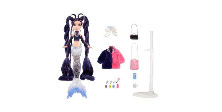 - INKLUSIVE: Flexible Meerjungfrauen-Modepuppe mit farblich veränderbarer Flosse, Wintermode, Ohrringen, Halskette, Nietenhandtasche, Motorradjacke, Tasse, Telefon, falscher Mascara, falscher Nagellack und 1 Puppenständer.