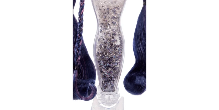 - MERMAID HAIR: Nera hat wunderschönes, lilafarbenes Haar mit rosa Strähnen, das zu einem gedrehten Schweineschwanz gestylt ist.