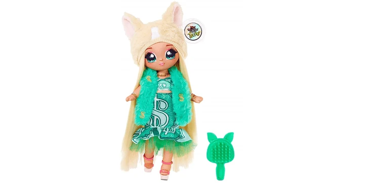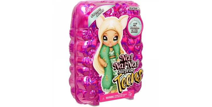 Na! Na! Na! Surprise Teens sind wunderschöne, 28 cm große, weiche Modepuppen mit viel Persönlichkeit und glamourösem Stil. Carmen Linda ist von einem Chihuahua inspiriert. Sie hat lange, blonde Haare und ein bedrucktes Gesicht sowie tolle Kleidungsdetails. Sie kommt mit einem aufregenden Auspack-Erlebnis. Öffne die Schachtel, um die schöne Puppe darin zu entdecken. Dann packe die Verpackung aus, um ihre geheimnisvollen Kleider und Accessoires zu enthüllen. Carmen Linda weiß, dass sich fabelhaft zu fühlen ein Geisteszustand ist. Sie hat ein glamouröses, grünes Kleid und einen flauschigen Kunstpelz-Schal. Sie hat auch einen wuscheligen Welpenhut und süße Plateauschuhe. Zu den bedruckten Details gehört funkelnder Goldschmuck. Sie ist die perfekte Geschenkidee! Sie hat auch ein Etikett mit ihrem Namen, Geburtstag und Motto. Sammle alle 5 schönen, weichen Teenager-Modepuppen.
