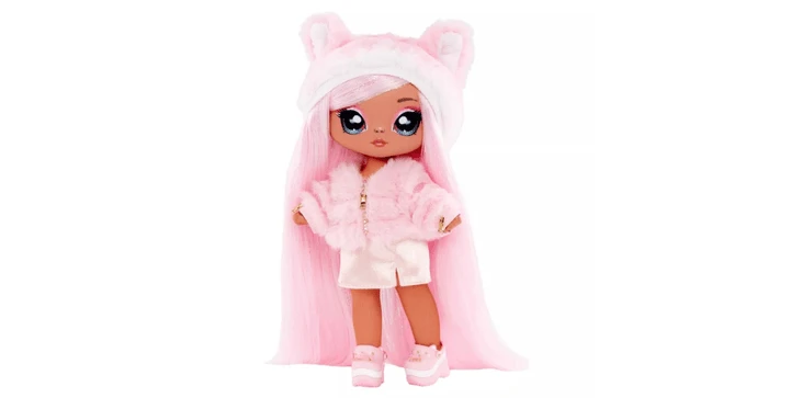 - MEET REENA DE LA ROSA: Für sie ist es der Schönheitsschlaf. Reena De La Rosa ist 7,5″ groß, hat langes, wunderschönes pinkes Haar und einen von einer getigerten Katze inspirierten Fuzzy-Hut. Sie trägt eine Steppjacke mit gestreiftem Pelz an jedem Ärmel, ein trägerloses Seidenkleid mit Schleife vorne und geformte Schuhe.