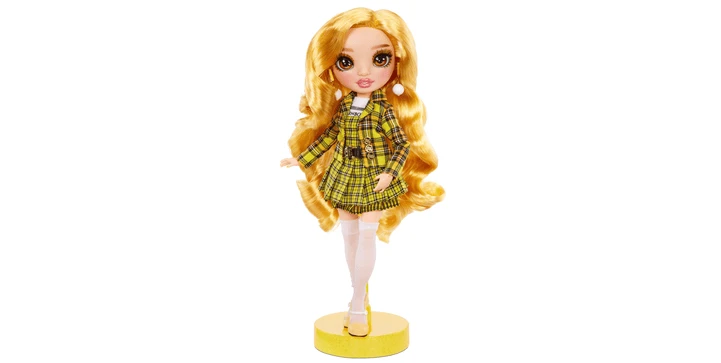 Sie trägt ein gelbes, kariertes Twill-Kleid mit Gürtelschnalle und eine Jacke mit geformten Knöpfen, ein T-Shirt, weiße Kniestrümpfe aus Chiffon und ein Paar Mary-Jane-Absätze. Ihr zweites Outfit besteht aus einem langärmeligen, durchsichtigen Chiffon-Top, einem gelben, ärmellosen Pullover-Top, einem bedruckten Rock und Riemchenschuhen. Ihre Arme und Beine lassen sich für viele glamouröse Posen biegen, oder du kannst sie auf dem mitgelieferten Puppenständer aufstellen.