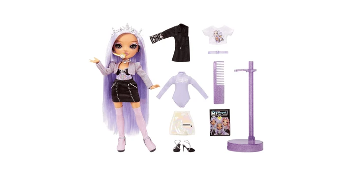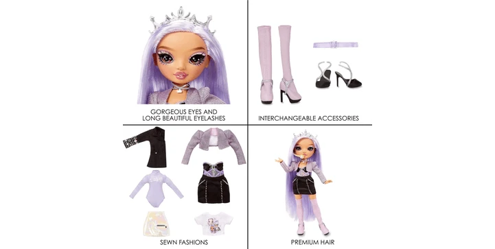 - 2 MIX & MATCH FASHION: Tiara ist die selbsternannte Anführerin der Gruppe, also trägt sie natürlich eine silberne Tiara mit Kristall. In ihrem trägerlosen Kleid aus Stretch-Charmeuse und Hologramm-Organza, das mit Strasssteinen verziert ist, ist sie immer bereit für die Bühne. Abgerundet wird ihr Look durch ein Bolero-Jäckchen aus Glitzerstrick mit schillernden silbernen Glitzerfäden, langen Nägeln und funkelnden Ringen, Armbändern, einer Halskette und superhohen Stoffstiefeln. Sie kommt auch mit einem zweiten kompletten Look, der einen Rock, ein Body-Outfit, einen stylischen Halbblazer, einen fliederfarbenen Gürtel und Riemchen-High-Heels umfasst