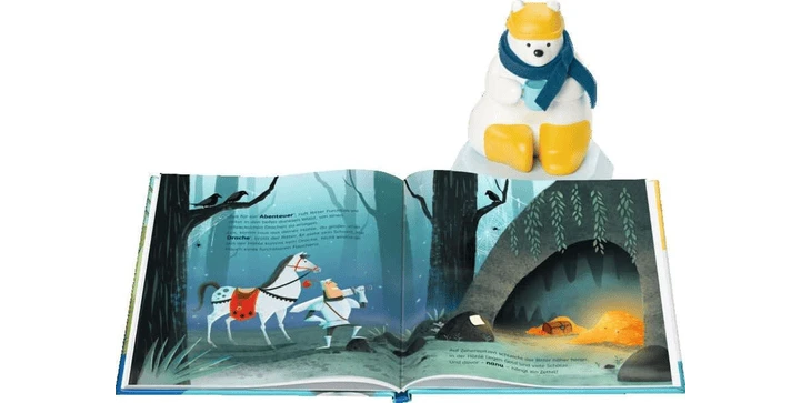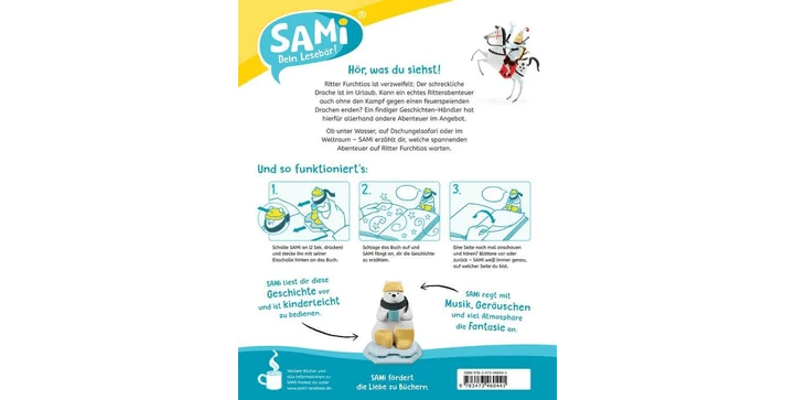 Mit SAMi – dein Lesebär tauchen Kinder ab 3 Jahren selbstständig in die Welt der Bilderbücher ein. Einfach ans Buch gesteckt, liest SAMi die Geschichte vor, während das Kind durch das Buch blättert. Dabei erkennt SAMi genau, auf welcher Seite sich das Kind befindet. Das Kind kann auf diese Weise frei im Buch vor- und zurückblättern und seine Lieblingsgeschichten beliebig oft anhören. So fördert SAMi die Selbstbeschäftigung und regt die Fantasie der Kinder an. SAMi kann verschiedene Bücher zu den unterschiedlichsten Themengebieten vorlesen: Neben wichtigen Themen aus dem Kinderalltag (z.B. Freundschaft, Streit), gibt es auch witzige Abenteuer und spannende Geschichten mit den Helden aus Filmen und Serien.