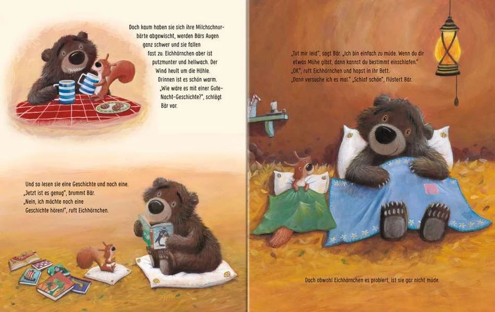Eichhörnchen und Bär sind fast bereit für ihren Winterschlaf. Aber Eichhörnchen ist einfach nicht müde. Viel lieber spielt es draußen im Schnee, möchte Geschichten hören, Toben und Krach machen. Sehr zum Ärger von Bär, der endlich seine Ruhe haben und schlafen möchte. Nachdem sich die zwei Freunde verkracht haben und Eichhörnchen sich im Schnee verirrt, merkt Bär, dass es besser ist, den Schlaf und nicht einen guten Freund zu verlieren. Lesebär SAMI nicht enthalten. Muss separat erworben werden.