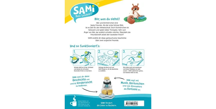 Mit SAMi – dein Lesebär tauchen Kinder ab 3 Jahren selbstständig in die Welt der Bilderbücher ein. Einfach ans Buch gesteckt, liest SAMi die Geschichte vor, während das Kind durch das Buch blättert. Dabei erkennt SAMi genau, auf welcher Seite sich das Kind befindet. Das Kind kann auf diese Weise frei im Buch vor- und zurückblättern und seine Lieblingsgeschichten beliebig oft anhören. So fördert SAMi die Selbstbeschäftigung und regt die Fantasie der Kinder an. SAMi kann verschiedene Bücher zu den unterschiedlichsten Themengebieten vorlesen: Neben wichtigen Themen aus dem Kinderalltag (z.B. Freundschaft, Streit), gibt es auch witzige Abenteuer und spannende Geschichten mit den Helden aus Filmen und Serien.