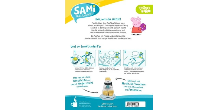 Drei lustige Geschichten nehmen dich mit in Peppas Welt: Peppas Teddy ist verschwunden. Wo kann er nur sein? Familie Wutz macht einen Ausflug in eine Tropfsteinhöhle. Dort fahren sie mit einem Boot und rutschen eine Seilbahn hinab! Madame Gazelle hat Familie Wutz zu sich nach Hause eingeladen. Doch was ist das? Ein Baum drückt das Haus zur Seite. Da kann nur Herr Bulle helfen: Er versetzt den Baum mit all seinen Bewohnern. Lesebär SAMI nicht enthalten. Muss separat erworben werden.