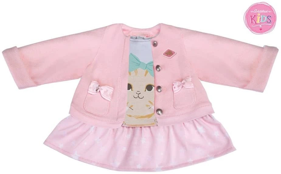 Bei diesem pastellfarbenen Komplettoutfit ist der plakative Frontprint mit Kätzchen Flora der Eyecatcher. Er ziert den hellen Jersey-Pullover und harmoniert wunderbar mit dem rosa Röckchen und der schicken Sweater-Jacke mit silbernen Knöpfen. Die 2 in 1-Kombination garantiert auch kleinen Puppenmamis einfaches An und Ausziehen. Für Puppen von 40 – 42 cm.