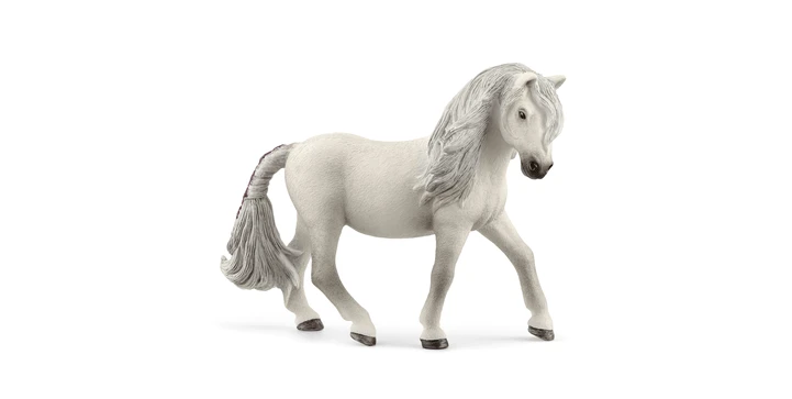 „Weißes, glänzendes Fell, ja, Horn, nein. Viele verwechseln unsere Islandpony Stute von Schleich® Horse Club mit dem Einhorn. Unser anmutiges helles Pferd ist jedoch in Island zu Hause – und nicht in den Wolken. Weil es in diesem vulkanischen Land seeehr kalt und seeehr heiß sein kann, trägt die Stute im Winter ein dickes Fell, das sie im Sommer wieder abwirft. Ihre unterschiedlichen Ganzkörperfrisuren präsentiert sie dann sowohl im Tölt als auch im Pass gekonnt auf dem Esstisch-Laufsteg. Da staunen die anderen Pferde nicht schlecht.