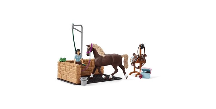 Der Waschplatz mit Horse Club Emily & Luna von Schleich® Horse Club ist sehr modern. Die vollbewegliche Mädchen-Figur Emily legt Sattel und Zaumzeug auf den Sattelbock, macht ihre hübsche Holsteiner-Stute Luna mit dem Halfter am Waschplatz fest und reinigt das Fell mit Striegel und Kardätsche aus der Putzbox. Der Wasserschlauch hängt an einem beweglichen Schwenkarm. Dadurch ist das Pferd von allen Seiten leicht zu erreichen. Eine rutschfeste Ringgummimatte sorgt während der kühlen Dusche für festen Stand.
