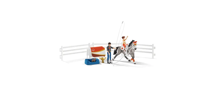 Das kleine Mädchen Mia kann sich mit Hilfe des Voltigier-Reitset von Schleich® Horse Club perfekt auf ihren ersten Wettbewerb vorbereiten. Der männliche Reitlehrer Tom macht das Turnierpferd an der Voltigier-Longe fest und lässt die Peitsche in seiner Greifhand sanft schnalzen, damit das Pferd innerhalb der beliebig steckbaren Zaunteile gleichmäßig im Kreis läuft. Hannahs Schwester Mia hat bewegliche Arme, mit denen sie sich festhalten und den großen goldenen Pokal entgegennehmen kann. Sattel, Zaumzeug und Decke sind abnehmbar und werden nach dem Training auf der Deckenablage verstaut. Das braune Kätzchen beobachtet das Geschehen interessiert, während sie sich in ihr gemütliches Körbchen kuschelt.