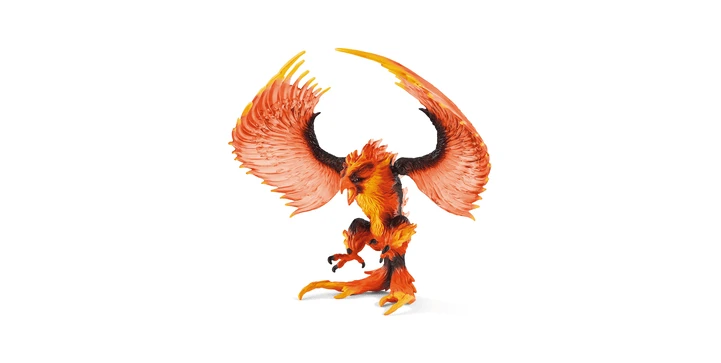 Seinen wachsamen Augen entgeht nichts: Hoch über den Vulkanen der Lava-Welt kreist der Feuer Adler von Schleich® Eldrador® Creatures majestätisch durch die Lüfte. Seine beweglichen Flügel sorgen dafür, dass der geschickte Vogel ordentlich Schubkraft besitzt und komplizierte Flugmanöver problemlos meistert. Der Feuer Adler nimmt selbst kleinste Bewegungen am Boden wahr – und handelt es sich dabei um einen Eindringling, fackelt der Greifvogel nicht lange: Er spannt seine beweglichen, transparenten Flügel auf, und rast im Sturzflug auf den Feind. Dabei zieht er einen leuchtenden Flammenschweif hinter sich her, der ihn wie einen herabstürzenden Kometen aussehen lässt. Für die Eindringlinge setzt es dann mehr als nur einen Satz heiße Ohren: Der Feuer Adler besitzt rasiermesserscharfe Krallen, mit denen er gnadenlos zupackt. Eine weitere Waffe, die er bei Attacken einsetzt, ist sein gebogener und spitzer Schnabel. Als krönenden Abschluss lässt der Feuer Adler mit seinen Flügeln einen gewaltigen Feuersturm entstehen, der seine Feinde einfach vom Platz fegt.