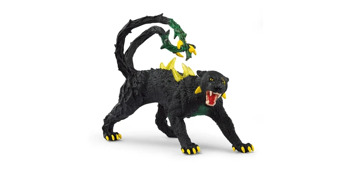 Obacht! Der Schattenpanther von Schleich® Eldrador® Creatures durchstreift wie ein dunkles Phantom das Dickicht des Dschungels. Mit seinem pechschwarzen Fell kann er sich unbemerkt im Schatten fortbewegen, und von dort aus seinen Feinden auflauern. Kommt ihm ein Eindringling zu nah, springt er mit seinen messerscharfen, ausgefahrenen Krallen aus der Deckung hervor und stürzt sich auf den überrumpelten Gegner. Oft kommt es anschließend zu einer atemberaubenden Verfolgungsjagd, die der ausdauernde Dschungel-Bewohner locker für sich entscheiden kann. Besonders stolz ist der gefährliche Schattenpanther auf seine beiden dornenbesetzten Lianen-Schwänze: Sie helfen ihm, auch bei Sprüngen aus großer Höhe die Balance zu halten. Außerdem kann er die starken Schwänze wie eine doppelte Peitsche einsetzen. Die Dornen an den Schwanzenden und auf seinem muskulösen Rücken sind richtig gefährlich: Sie enthalten ein lähmendes Gift, das Feinde sofort kampfunfähig macht.