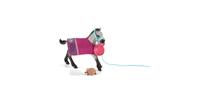 Der Spielspaß mit Fohlen von Schleich® Horse Club enthält einen extra für Pferde entwickelten Spielball. Er hat einen Griff, den das Quarter Horse Fohlen mit den Zähnen festhalten kann. Beim Spielen verwechselt das Fohlen einen kleinen süßen Igel mit dem Ball, merkt aber schnell, wie stachlig er ist! Zum Glück passiert den beiden bei der lustigen Begegnung nichts und sie werden Freunde. Nach dem Herumtoben stärkt sich das Fohlen am Nuckelfläschchen und bekommt eine warme Decke umgelegt, damit es nicht friert.