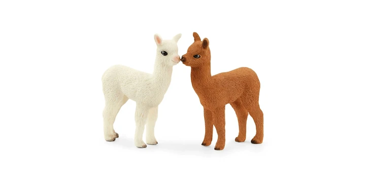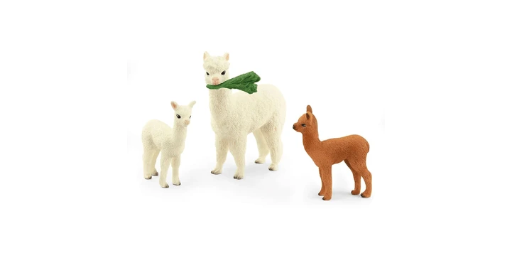 Die Alpakafamilie von Schleich® WILD LIFE stammt aus den südamerikanischen Anden, wo die Tiere vor allem wegen ihrer weichen, wärmenden Wolle gezüchtet werden. Sie gehören zu den höckerlosen Kamelen und haben ein sehr ruhiges und friedliches Wesen. Die beiden Jungtiere besitzen unterschiedliches Fell: eines ist weiß und das andere ist braun. Sie werden etwa 6-8 Monate von ihrer Mutter gesäugt, bevor sie anfangen, sich von Gräsern zu ernähren.