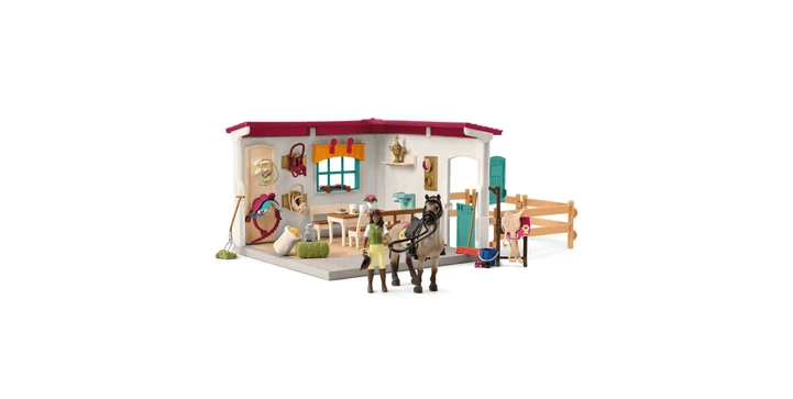 Die Sattelkammer von schleich® HORSE CLUB ist perfekt ausgestattet: Bürsten und Striegel liegen schon auf dem Tisch, um das Pferdefell wieder zum Glänzen zu bringen. Diese Wohlfühlbehandlung hat es gern. Im Schrank sind verschiedene Pferdedecken, die unter den Sattel gelegt werden können. Das passende Zaumzeug hängt natürlich auch an der Wand. Hier lässt es sich aushalten! Das finden auch Hund und Katze. Die beiden sind schon ganz aufgeregt und leisten beim Striegeln Gesellschaft. Den Apfel bekommt aber das Pferd zur Belohnung!