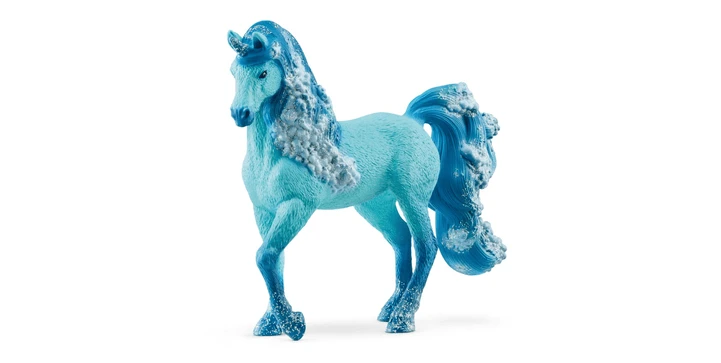 Gutmütig und freundlich schaut die Elementa Wassereinhorn Stute aus ihren schönen, dunklen Augen, während sie grazil zum Traben ansetzt. Wo möchte sie denn hin? Ihr glitzerndes Horn funkelt gemeinsam mit dem blauen Schopf im Licht und ein kleiner Seestern hält die Mähne aus dem bezaubernden Gesicht. Viel Glitzer und ein paar schillernde Schaumkronen haben sich in der üppigen, blauen Mähne verfangen. Ob sie direkt aus dem Meer gestiegen ist? Ihr schöner Schweif ist jedenfalls so bezaubernd wie ein tosender Wasserfall.