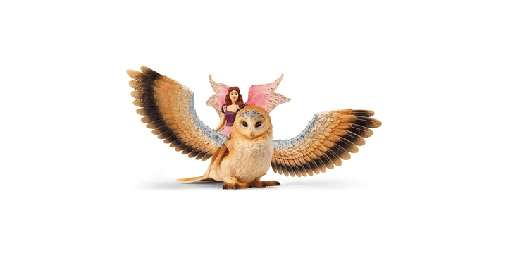 Der Federschmuck und die reich verzierten Flügel der Eule glitzern silbern im Sonnenlicht. Ihre Flügelspitzen schimmern bronzen. Zusammen mit der Elfe fliegt das magische Wesen sanft über die Weiten der farbenprächtigen Blütenfelder von bayala. Dort angekommen werden sie schon neugierig von den anderen Elfen empfangen. Die Weisheit und Sanftheit dieses geflügelten Zauberwesens sind im ganzen Elfenreich bekannt.