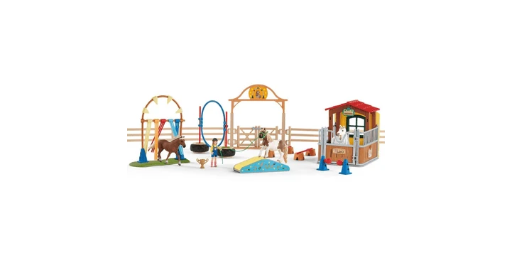 Das Agility Training bietet einen spannenden Hindernis Parcours inklusive einer Pferdebox, Paddocks und großem Eingangstor!