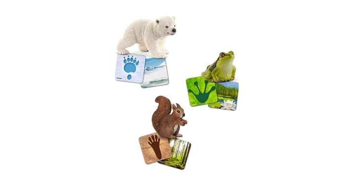 Lerne die Tierwelt mit den Lernkarten von Schleich kennen! Auf den Lernkarten sind der Lebensraum und der Fußabdruck von drei Tieren abgebildet: dem Eisbärjungen, dem Eichhörnchen und dem grünen Laubfrosch. Zu welchem Tier gehört welche Lernkarte? Ordne sie den drei Tierfiguren zu, die ebenfalls im Set enthalten sind!