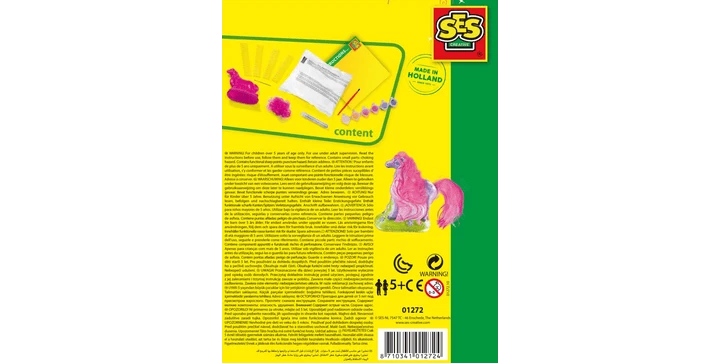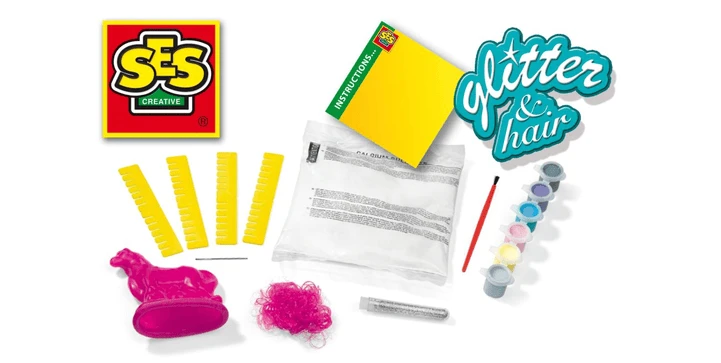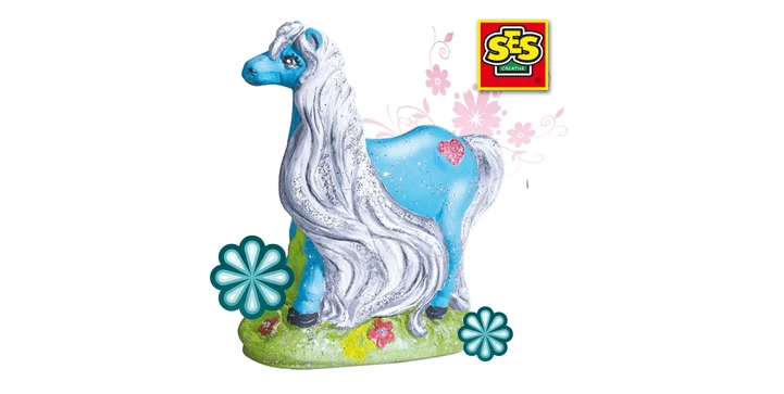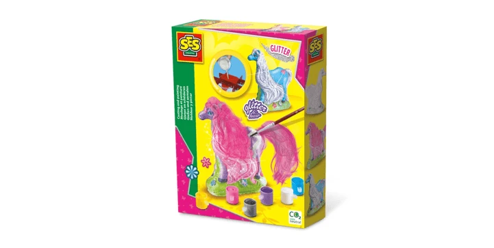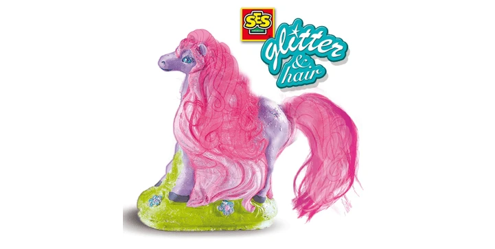 Gipsgießset Pferd mit echter Mähne und Glitzer: das Haar für die Mähne durch die Öffnung der Gipsform stecken, den beiliegenden Gips mit Wasser anrühren, in die Form gießen und trocknen lassen. Nach dem Trocknen kann die Gipsfigur mit den Farben bemalt werden und mit viel Glitzer verziert werden.