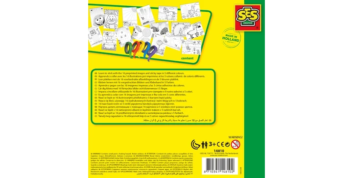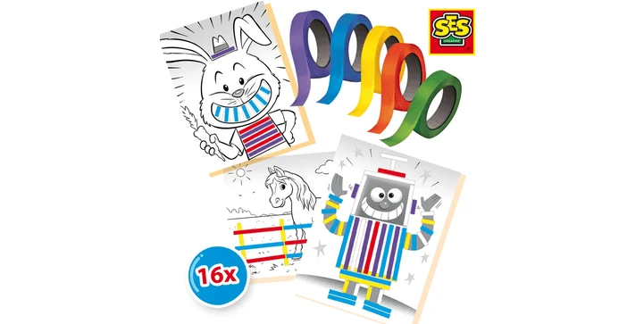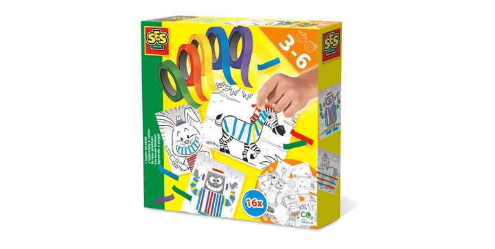 Ich lerne kleben von SES. Bei diesem Set müssen Kinder Farbstreifen von der jeweiligen Rolle reißen und auf die vorgedruckte Vorlage kleben. So entstehen nach und nach viele bunte Bilder. Eine Beschäftigung für lustige Kinderfeste.