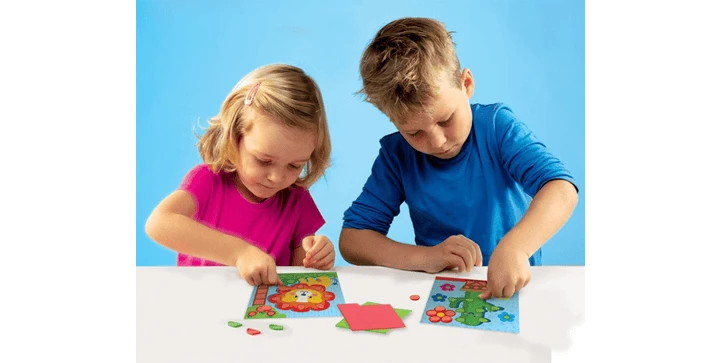 - Mit den Mosaikaufklebern in unterschiedlichen Farben und Formen lernst du, auf vorgedruckten Karten Mosaike zu legen