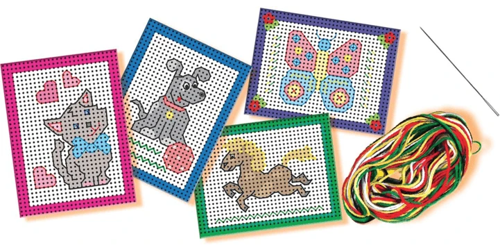 Vier wunderschöne Stickvorlagen, mit denen kleine Kinder ganz einfach das Sticken lernen. Die Karten sind vorgedruckt und perforiert, so dass es ganz einfach ist, die Bilder mit Nadel und Faden zu besticken.