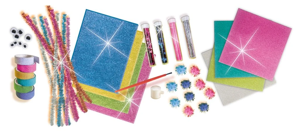 Mit diesem Set voller Glittermaterialien kannst du dich so richtig austoben; ein Must-have für alle, die Glitter lieben! So hast du immer genug Material, um deine Bastelarbeiten besonders schön zu gestalten. Verzierst du deine Schulsachen oder dein Zimmer? Oder machst du Glitterkarten oder Figuren? Was immer du möchtest!