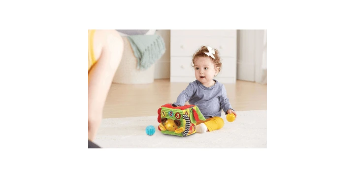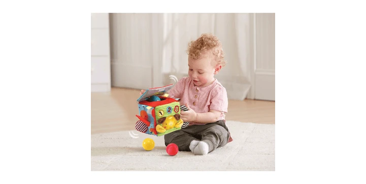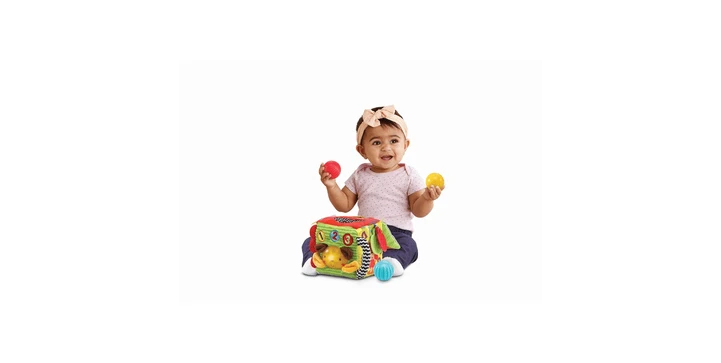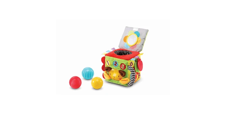 Kuscheliger Spielspaß von fünf Seiten: Der 1-2-3 Kuschelwürfel regt mit allerlei Spielelementen und Materialien die Sinne kleiner Entdecker an: So lassen sich zum Beispiel die drei farbenfrohen, weichen Plastikbälle mit verschiedenen Oberflächenstrukturen in den Würfel einwerfen, zwei bunte Anhänger helfen beim Zahnen, ein kleiner Spiegel fördert die Selbstwahrnehmung und zahlreiche Stoffelemente stimulieren den Tastsinn. Darüber hinaus bringen drei Tasten den Kindern Farben, Zahlen sowie Formen