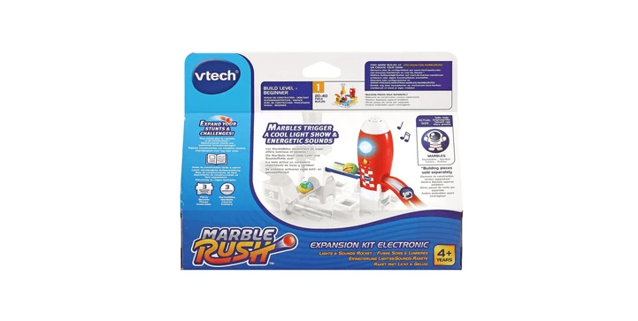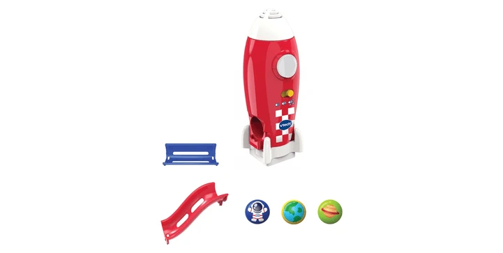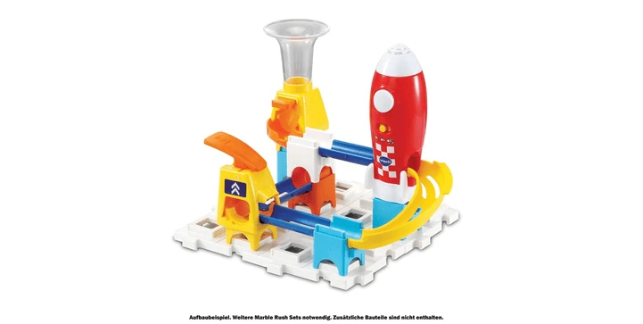 - Die Rakete (elektronisches Sound- & Lichtmodul) reagiert mit witzigen Sounds und Lichteffekten darauf, wenn die Kugeln hindurchrollen; zudem spielt sie coole Musik während des Spielens