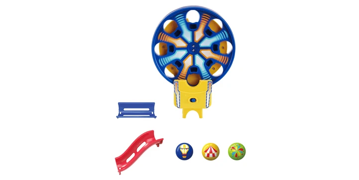 - Das motorisierte Riesenrad nimmt die Kugeln automatisch auf und befördert sie auf die nächste Ebene